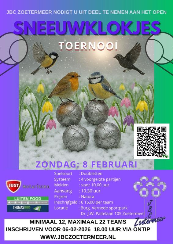 Op zondag 8 februari 2026 wordt het Open Sneeuwklokjestoernooi gehouden. Het spelsoort is Doubletten en het zijn 4 voorgelote partijen.